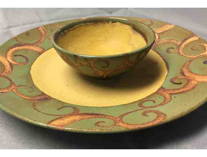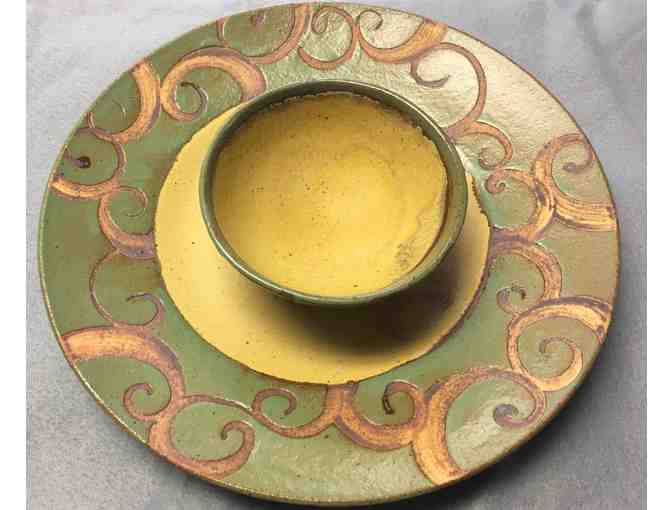 This Chip & Dip pottery set was made by a Philadelphia artist, Liz Kinder Pottery. The Celadon green and Sunflower yellow are sure to complement any decor.