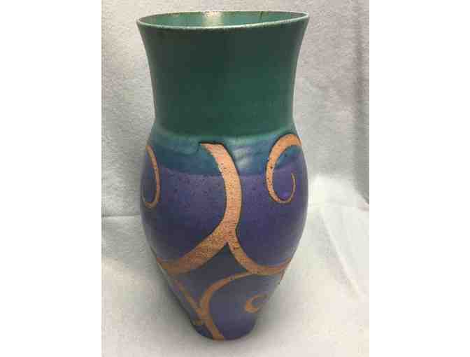 This beautiful handmade vase by Philadelphia artist Liz Kinder Pottery is teal and eggplant and will look perfect in your home!