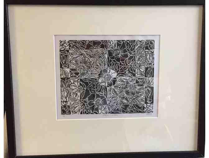 It is the first print in an edition of ten. "A Rose is a Rose" was carved in a repeated design centered around an open rose alternating positive/negative space. The print measures 8"X10" and is matted and framed in a 16"x20" format.