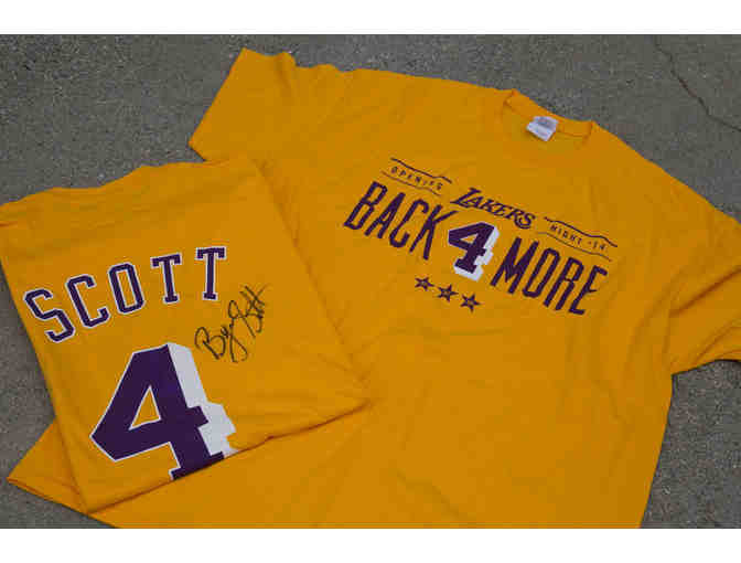 Own a piece of NBA history - this is a Lakers t-shirt signed by none other than Byron Scott! Scott was a key player for the Lakers during the Showtime era, being a starter alongside Magic Johnson, James Worthy, Kareem Abdul-Jabbar and A. C. Green. He had a long and storied career, and ended up coaching the Lakers for two years.