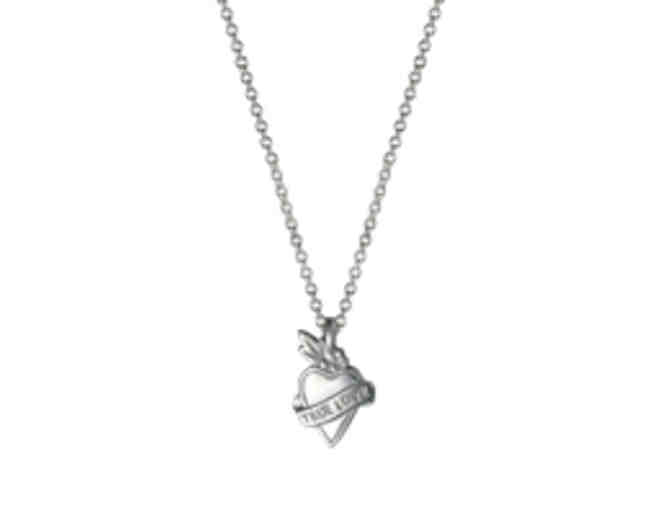 The heart expresses the power of love, friendship, intelligence and courage. This beautiful and bold banner heart motif features a heart measuring approximately 3/8" in width and 5/8" in length. The words "True Love" are engraved on the banner, with the pendant suspended from 16" or 18" sterling silver chain and finished with a spring ring closure.
