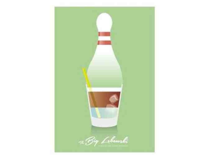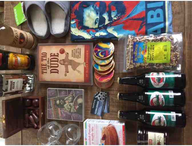 Basket includes a DVD of The Big Lebowski (obviously!), comfy lounge gear, miniature bowling set, vodka and Kahlua, cocktail glassware, bowling and movie tickets, and commemorative merchandise and snacks.