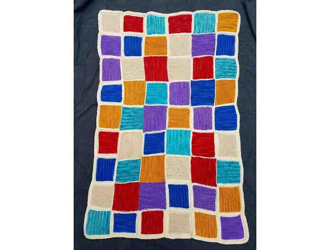 Gorgeous Lap Blanket - knitted by Ms. Tree's grade 4 class with parent volunteer, Nita Stull. 100% wool in Sun Valley colors of aqua, gold, lilac, oat, red and dark blue.