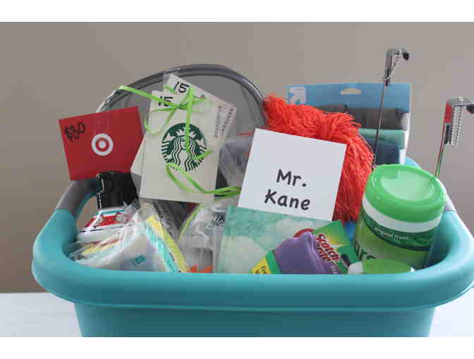 Cleaner holder/organizer, over-the-door organizer, sponges, microfiber cloths, duster, Seventh Generation laundy detergent and all purpose cleaner, laundry pacs, dish soap, Green Works wipes, Scentsy warmer/wax and counter cleaner, Starbucks gift cards (total$30), Target gift card ($30), laundry basket and "The Life Changing Magic of Tidying Up" by Marie Kondo