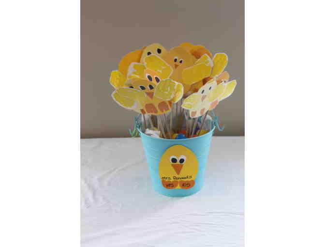 Super cute little chicks in a fun blue pail. The chicks were 100% made by the students. No templates were given. The wings were made with their hand prints. Inside the eggs are candy. Yum!