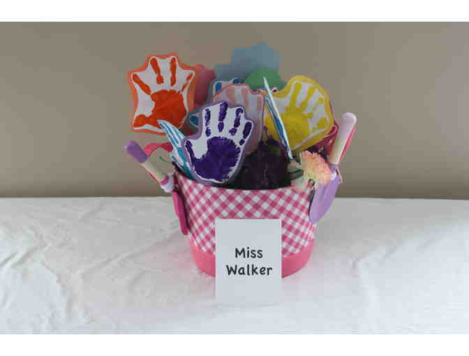 A super cute bucket with gardening tools and handprint "flowers".