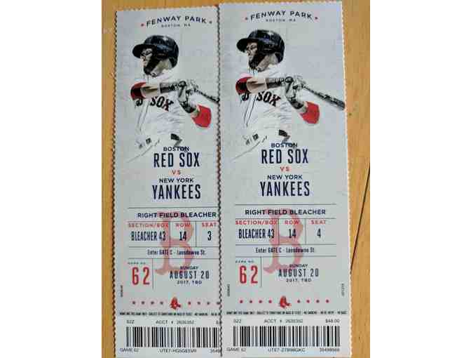 Watch one of MLB's greatest rivalries in action on Sunday, August 20, 2017! Enjoy two tickets to the Red Sox vs. NY Yankees in Fenway. They are for bleacher seats.