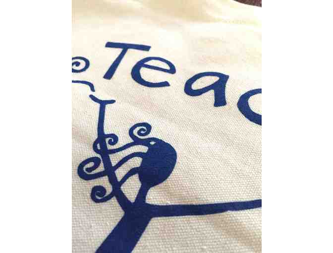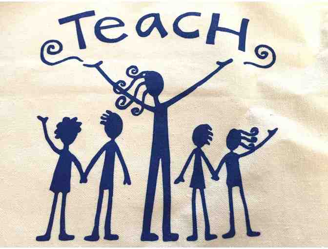 This is a 15 x 15" cotton canvas tote, Navy handles, gusseted bottom. The "Teach Design" was designed by Anna Birch and screen-printed locally. Great for the teachers in your life!