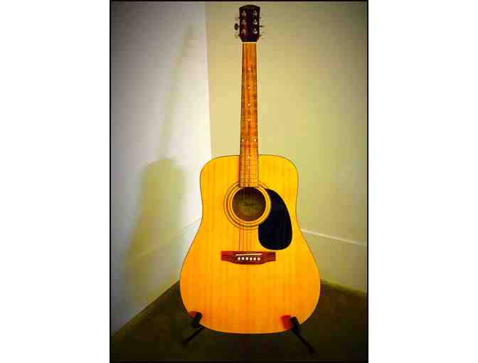For all music lovers, learn to play or enjoy this beautiful acoustic guitar. It is packaged with its own stand for displaying anywhere in your home.