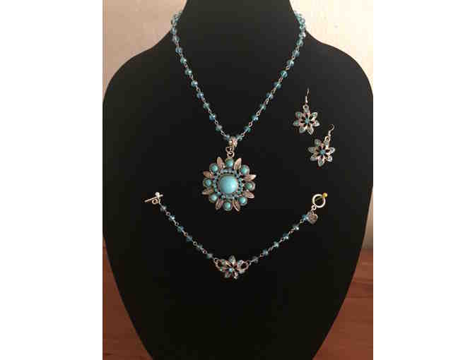 The necklace is made of a silver colored chain with turquoise colored beads holding a stunning round pendant: a flower with multiple silver patels and small round turquoise colored stones frame a circle of glass beads with another turquoise stone in the middle. The bracelet is made of a turquoise colored beads chain with a flower in the middle accentuated with beads. The same flower pendant is featured in the earrings. Measurements: Necklace measures 18 inches, pendant 2 inches; Earrings measure 1-1/2 inches, pendant 1 inch; bracelet measures 7 inches including a 1 inch pendant.