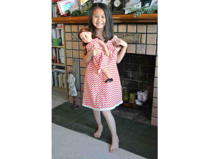 You are bidding on this one of a kind, handmade dress set that includes a dress for 6 years old and a doll dress that fits 14-16 inches dolls. The adorable chevron fabric is so cute with the white lace trim on the bottom hem. Your beloved child will have a great time wearing it and will brighten up everyone's day!