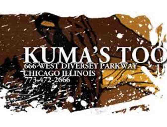 You are bidding on a $50 gift card to Kuma's or Kuma's Too.