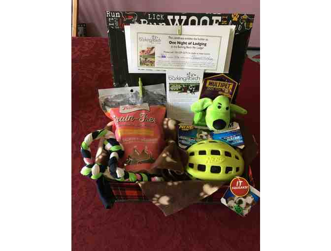Includes: 3 dog toys, pkg of dog biscuits, One Night Lodging free (with required