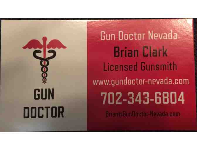 The winner of this package will receive a proper cleaning and safety inspection of your firearm. The Gun Doctor will clean and inspect your firearm for safety, make recommendations if needed and advise you of possible upgrades that you can have made to your firearm. Always friendly, always professional. Gun Doctor Nevada. First Aid for Firearms. Federal Firearms Licensed.