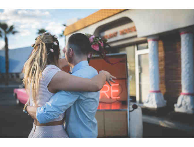 The winner of this package will receive a Pop-Up Wedding including officiating, flowers for the couple, wedding cake donuts, champagne & the teardrop reception area in a Las Vegas desert location.