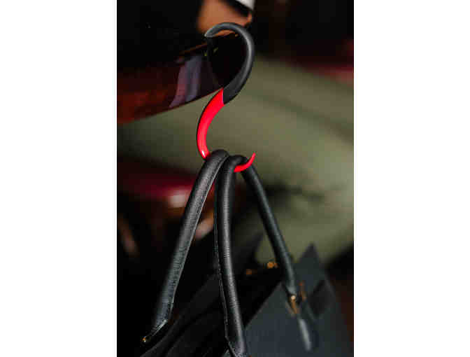 The Embrace is a chic and reliable solution that is guaranteed to hold travel bags, purses, umbrellas, shopping bags, coats, etc... safely away from theft, danger, and dirt.With its unique patented hinge, the Embrace transforms into a sleek S-shape hook in one quick twist and attaches to just about any surface. The Embrace also doubles as a stylish accessory available in a variety of bright and neutral colors that can be used to adorn any handbag, luggage piece or garment. It is both lightweight and strong weighing just 0.9 oz/25 g and holding up to 22 lbs/10 kg.