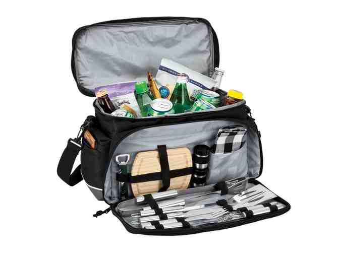 Complete picnic basket cooler set features a 15-can capacity cooler with 2 zippered side pockets, 1 front and 2 backside pockets, zippered watertight main compartment with heat sealed PEVA lining, and a removable and adjustable shoulder strap. The picnic set includes 2 each of stainless steel forks, knives, and napkins and a BBQ set with tongs, spatula, & fork. It also comes with salt & pepper shakers, a cutting board, and a bottle opener/corkscrew.