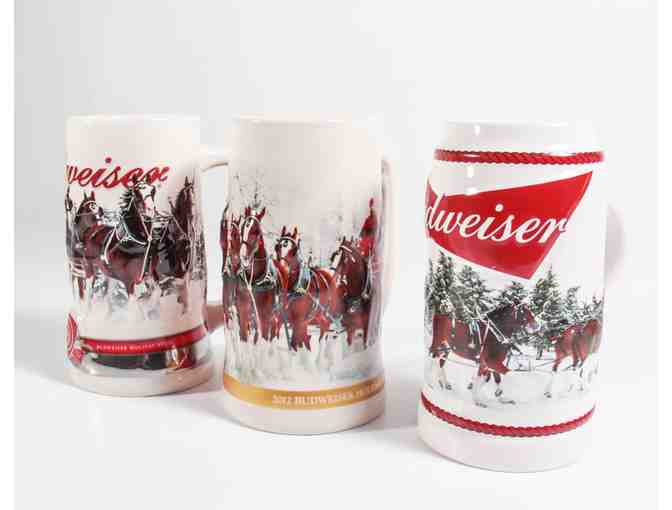 The winner of this package will receive three limited-edition Budweiser holiday steins, each with a different design. Donated by Morris Law Group. Set includes the following steins: