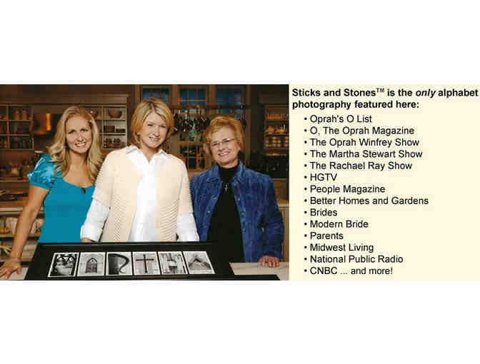 Sticks and Stones® is the original in creating art from letter photography and it began as an alphabet lesson for our daughters. Our family began letter hunting™ while on walks or while spending the day at the park. We would look for different letters of the alphabet in nature (STICKS) and architecture (STONES). We began taking photographs to remember our adventures, creating a collection of alphabet photography based on our family's hobby. Brad, the girls, and I continue to letter hunt™, so keep checking in as new alphabet photography is added to the "Letters Gallery". In October 2005, I was a room mom for our middle daughter, Julianna's, preschool class. Therefore, I was in charge of finding a gift for the teacher when she was married during the school year. I didn't want to give the teacher a gift from her registry -- that just wasn't memorable enough. I wanted to give her something that she would look at in 20 years and know exactly who the gift came from. I was suddenly faced with the dilemma we all have at some time in our life: what is the perfect gift that will never be forgotten? As I discussed this with Brad, he suggested I try something we'd never seen done before: having our alphabet photography custom framed spelling out the teacher's new last name. Once the other mothers saw the gift at the class bridal shower, and the teacher displayed her gift in the Teacher's Lounge, everyone wanted one of their own. Sticks and Stones® has grown from one creation to being available in many catalogs and boutiques. We are also honored to be the gift of choice for many including Oprah Winfrey, The Obama Family (Sticks and Stones® is hanging in The White House!), Martha Stewart, Rachael Ray, and many more. Oprah personally told Brad and me, "This is the perfect gift for the person who has everything because no one has anything like this!" Sticks and Stones® is the only personalized name art endorsed by and featured on The Oprah Winfrey Show; Martha Stewart; Rachael Ray; HGTV; CNBC; Fine Living; TBS; O, The Oprah Magazine; Oprah's exclusive O List; People; Better Homes and Gardens; Brides; Modern Bride; Parents; Lucky; Midwest Living; Relish; and many more publications around the country. Thank you for visiting Sticks and Stones®. It's an honor to create your alphabet photography family heirloom!