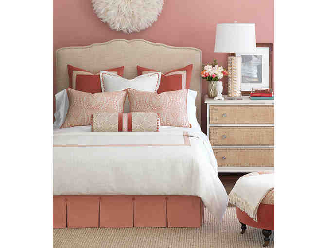 This custom-made, handcrafted package includes one bed skirt, one bedspread, or one comforter or one duvet, two pillow shams, and three Euro shams in any of Decor 8’s Class A fabrics. The bedding ensemble will be especially designed to complement your home in color and texture, and will be custom-made to fit your bed. Package includes: professional on-site measurements, design consultation, and white-glove delivery.