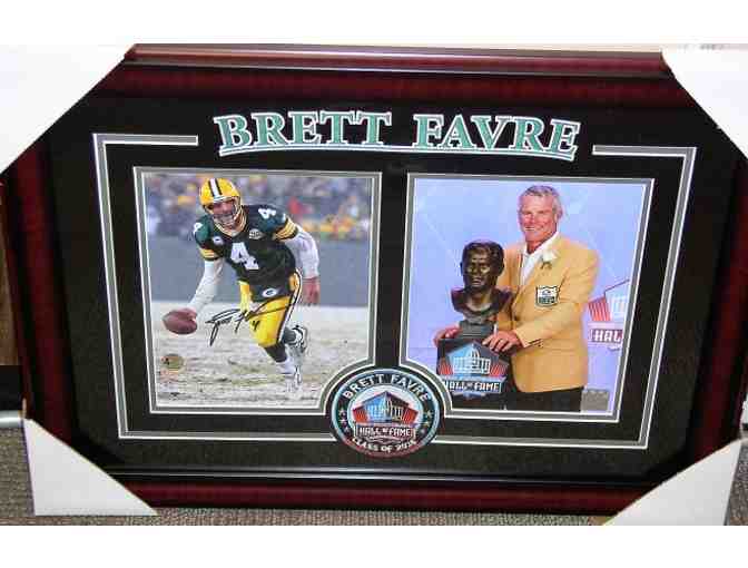 Brett Favre- 2-8”X10”photos (one action shot and one image from 2016 Hall Of Fame Ceremony) one of the photos is signed. Laser etched matted framed with 2016 Hall Of Fame patch
