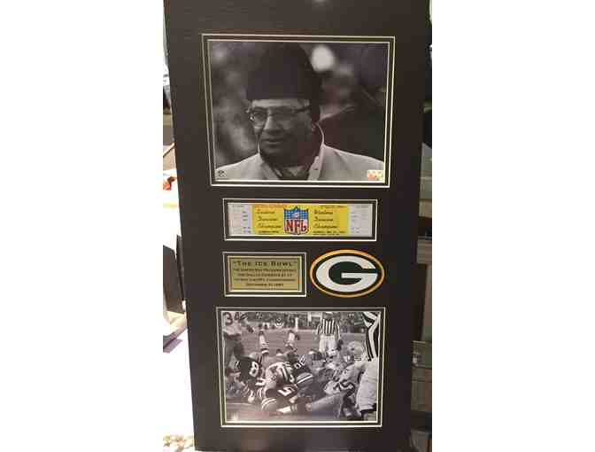 Green Bay vs Dallas Cowboys “Ice Bowl” – (2) 8x10” photo’s one of Coach Lombardi on the field & one of Bart Starr “The Sneak”, laser-cut logo, replica game ticket, laser engraved detailed nameplate framed.