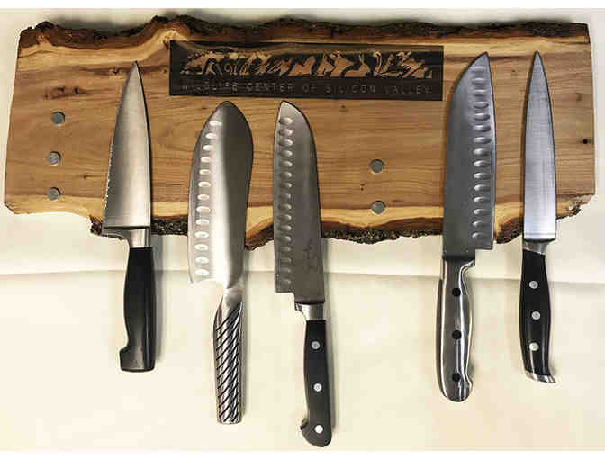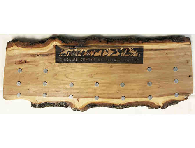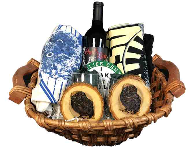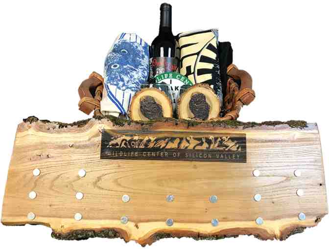 Hello local supporters of the Wildlife Center of Silicon Valley! Here is a great opportunity for you to own some of WCSV’s finest merchandise. Own two of our one of a kind tote bags and four magnets, which can be displayed on your car or refrigerator. There are also two new designed WCSV t-shirts (size M), which can be exchanged for a different size if need be. Display in your home a handcrafted knife holder with WCSV’s logo. Lastly, enjoy a bottle of donated Owl’s Lair red wine with two handmade owl coasters and two Wingin’ It glasses. What a great package!