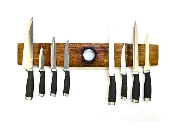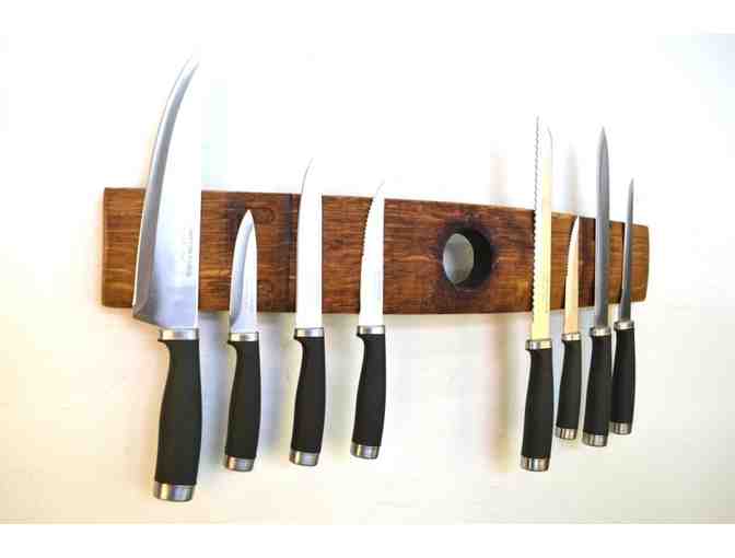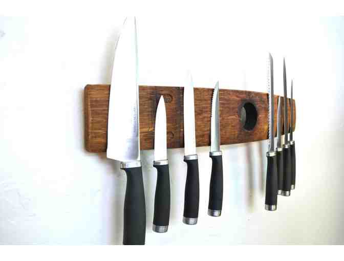 This a magnetic barrel stave knife holder crafted from 100% recycled Napa wine barrels. Each barrel is cut and dried for up to a year before it is sanded and finished with a food safe mineral oil. Re-oil the board occasionally and it will last a lifetime. Each board is fitted with eight extra strong magnets to keep even your largest knives in place.