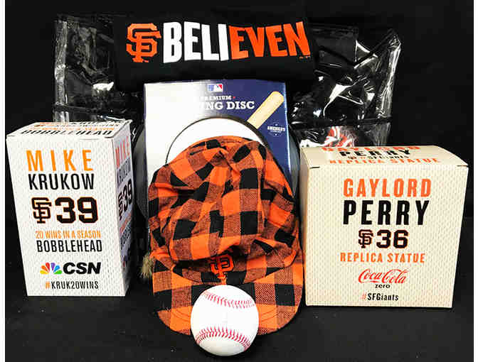 This basket also includes amazing swag: An autographed baseball by Denard Span valued at $150, a Mike Krukow Bobblehead, a Gaylord Perry Replica Statue, an XL Giants Believen t-shirt, an insulated ear flap Giants hat, and a Giants flying disc.