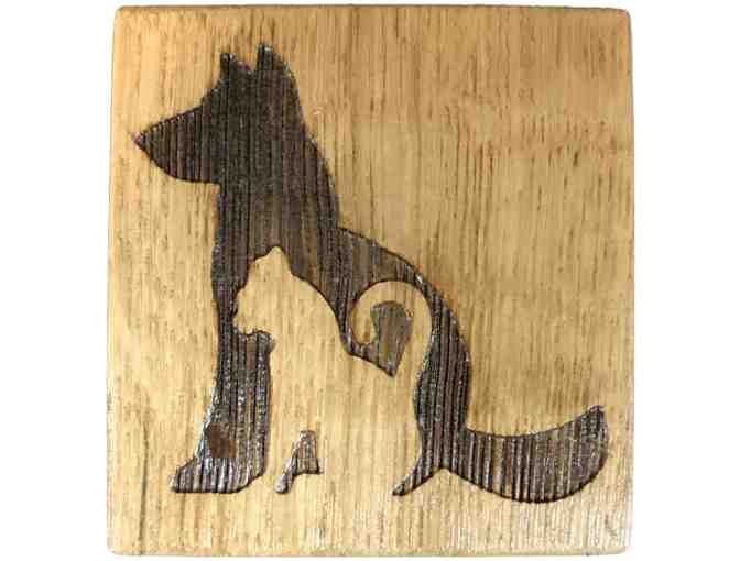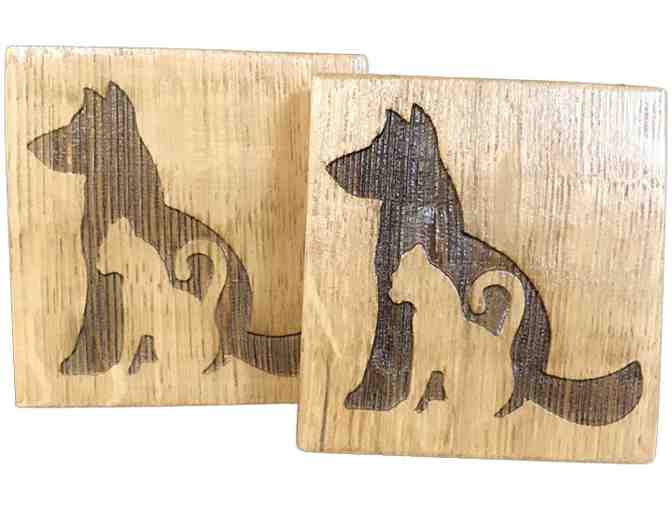 Each coaster was made from oak wine barrels that previously held wondrous wines from California. Each coaster is made one at a time, and no two items are exactly alike due to the mysterious wood grains. Each coaster was made from 100% recycled wine barrel staves, and then was laser engraved with a charming image of a dog and cat sitting side-by-side.