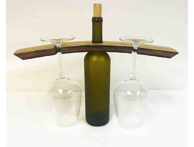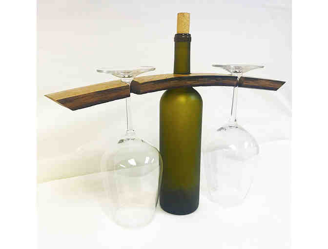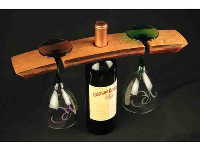 This finely hand-crafted wine bottle holder and glass holder is made from a oak wine barrel stave from the Paso Robles Wine Country in Central California!