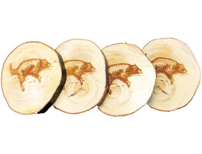 This wonderful set of 4 rustic, live edge coasters was created from wood harvested from either from Big Sur, California, the Sierra Nevada mountains or the Oregon Coast. Each coaster has been laser engraved with an image of a raccoon.