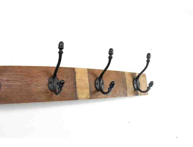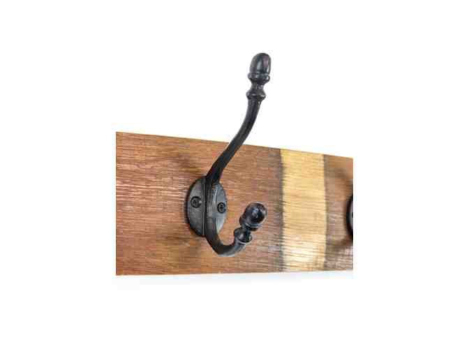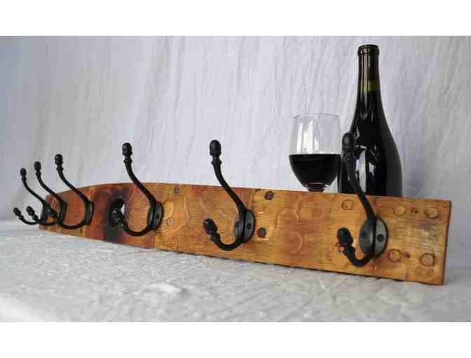 This coat hook rack was crafted from Napa Valley wine barrels and custom coat rack hooks made from the metal wheels of a 1940s freight train. The wood is dried, sanded and sealed with a clear UV finish to preserve the wood for a lifetime of use. The metal hooks are finished with a baked black powder-coat and durable enough for hanging coats, keys, hats and leashes.