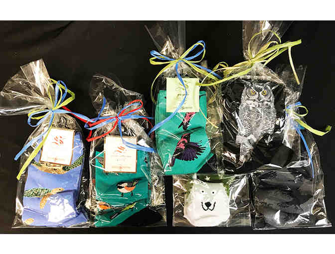 These well made animal socks are the perfect way to keep your feet toasty in the winter months! Socks included are: women’s “Raven Lunatic”, Chickadee Lagoon, Great Horned Owl, Sea Turtles, Hummingbird socks and a pair of children’s Wild Wolf socks.