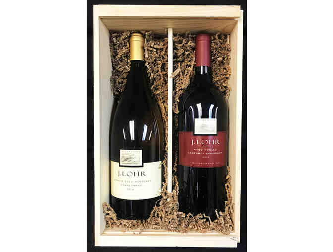 Enjoy two magnum bottles in this wooden crate! One bottle is a 2015 Cabernet and the other a 2016 Chardonnay.