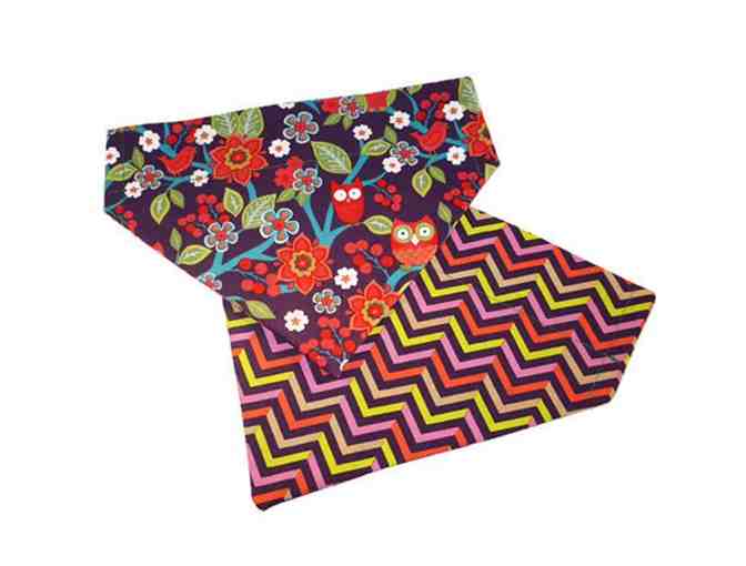 Whooooo doesn't love a good owl print? OK that might have been a little corny but this print is adorable. Turquoise tree branches snake along the purple background and feature a cute little owl and brightly colored flowers. The other side is a coordinating fabric with lime green, pink and orange chevron.