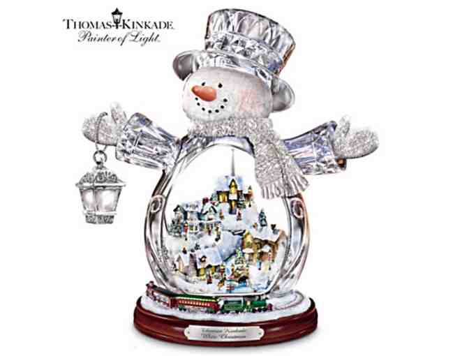 Snowman with fully sculptural, hand-painted illuminated Thomas Kinkade village in his crystal clear tummy and a train runs at the base. The perfect addition for the Christmas collector.