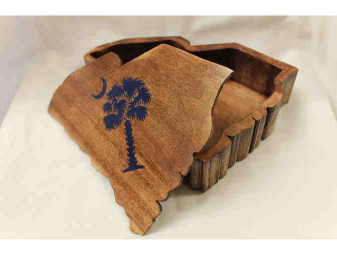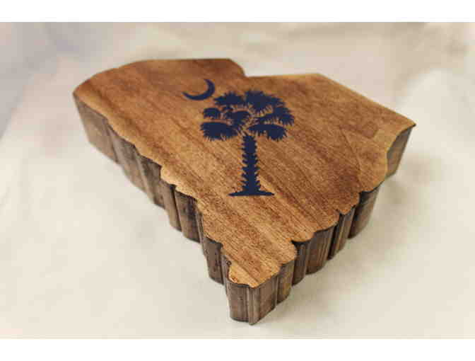 Wooden box in the shape of the palmetto state with navy state flag symbol. Dimensions 8 x 6 x 2. Created by local craftsman Donnie Brown.