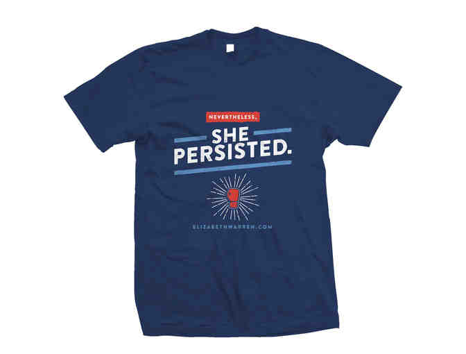 You are bidding on a cotton T-shirt bearing the immortal final three words Mitch McConnell drawled about Senator Elizabeth Warren after silencing her on the senate floor during Jeff Sessions’ confirmation hearing: “She was warned. She was given an explanation. Nevertheless, she persisted.” Includes a card with a personal thank-you from Senator Warren. Don't be fooled by imitations--this is the official shirt from the Warren campaign itself. Size: Large