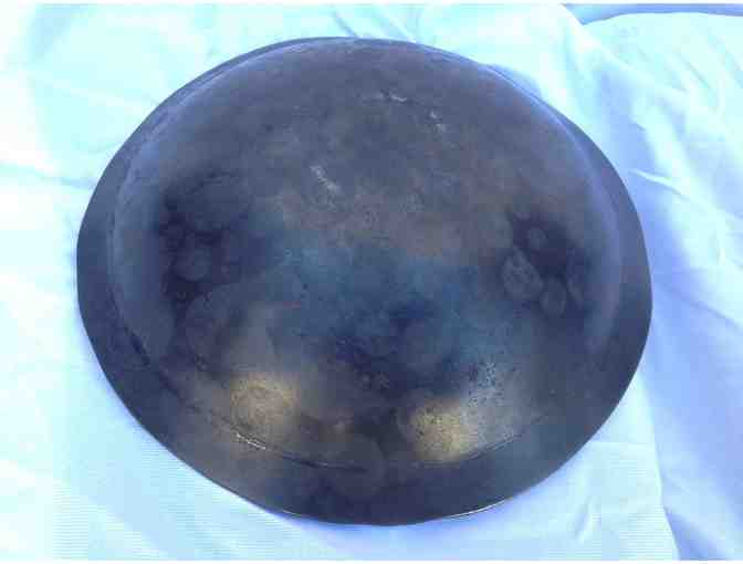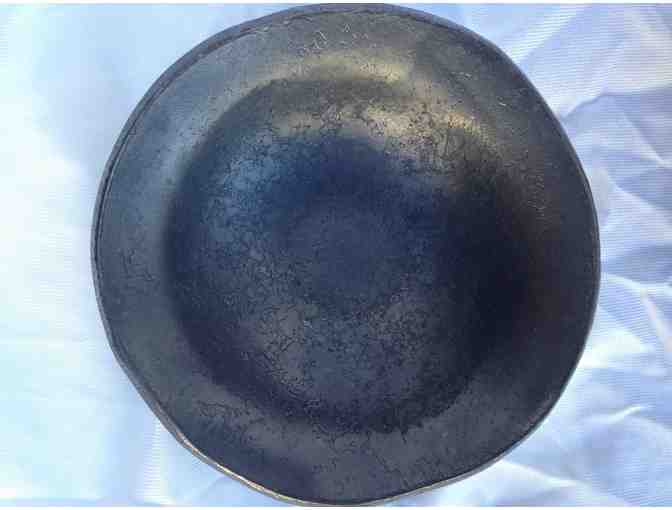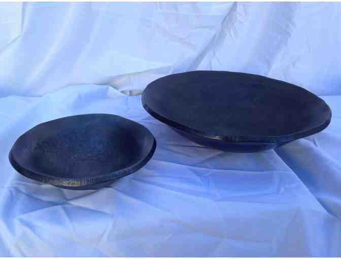These hand forged heavy steel bowls come from The Blacksmith Shop in Ferndale, CA. They were crafted by artists Jon and Seri Sargity. The bigger bowl is 9" diameter and 2.5" deep. The smaller one is 5.25" diameter and 1.5" deep. Both bowls are 1/4" thick steel.