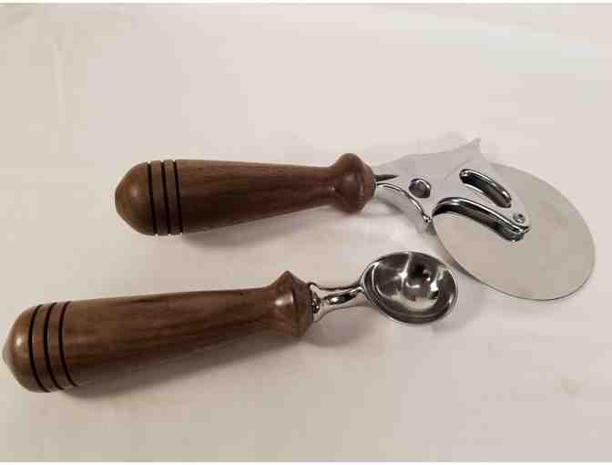 The Walnut handles on this set are turned by hand on a wood lathe and are removable for cleaning. The pizza cutter is 11" long with a 4" diameter cutting blade. The ice cream scooper is 8" long.