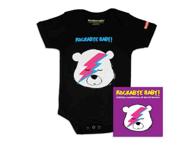 Rockabye Baby! David Bowie Gift Set includes: one "Rockabye Baby! Lullaby Renditions of David Bowie" CD and one Rockabye Baby! Onesie featuring album artwork. Lullaby renditions CD features gentle instrumental versions of David Bowie's greatest hits. The onesie is extra-soft 100% Skal-certified organic cotton, nickel-free snaps and dyed with non-toxic azo-free dyes. Size 6-12 months.