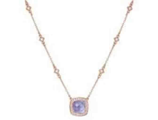 The necklace is set with a genuine square cushion checkerboard-cut amethyst surrounded by Lafonn's signature Lassaire simulated diamonds in rose gold plated sterling silver. Approximate length: 18 inches.