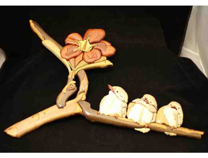Travel to a tropical island just by looking and feeling this amazing wood sculpture! A beautiful hibiscus flower sits atop a wooden branch. Three sweet baby birds sit puffed up on the branch, one looking inquisitively at the dark reddish brown flower and the other two looking at you, the observer. This 3D sculpture is made using a technique called Intarsia where various shapes, sizes, and species of exotic woods are fit together to create a mosaic-like picture. The exotic woods used in each bird are Blue Pine, Yellowheart wood, Poplar wood with dark Cherry wood beaks and feet. The hibiscus flower petals are made of Bloodwood, Cherry and Padduk woods with a light throat of Yellowheart wood. The branch is made of deeply grained Marblewood, Poplar and Walnut woods.
