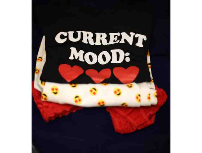 Nothing's softer than the size medium pajama set. The top is a long- sleeve black tee with “Current Mood” in red with 3 red hearts underneath. The bottoms are white cotton/rayon thermal weave with smiley yellow emoji prints. The pants have cuff legs and a cinch tie waistband. Nice! Now, underneath those sweet pj's is something slightly naughtier. A red stretch lace thong panty and matching brassiere will not require red heart emojis to evoke the current mood. One size fits most.