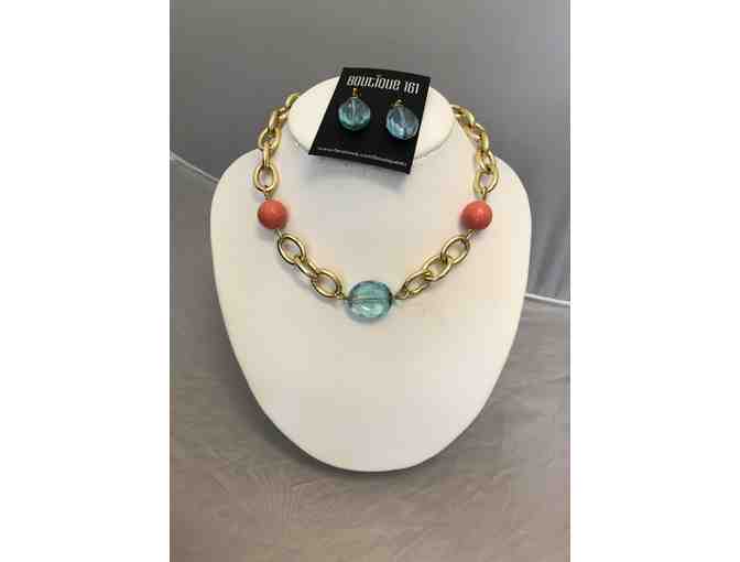 Deborah Grivas Designs created this lovely gold tone chain link necklace and earring set. The necklace measures approximately 17" and expands to 19" long. There is a 1" pale blue crystal in the center and two 1/2" coral colored beads a few links away from the crystal on either side.