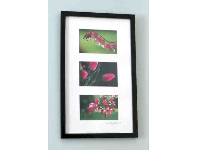 The size of each photo is 3.5 x 5.5 inches. The 3 photos are matted in a white acid-free mat and framed in a black, wood frame. The overall size of the framed photo is 11 x 18 inches. It is wired and ready for wall hanging.