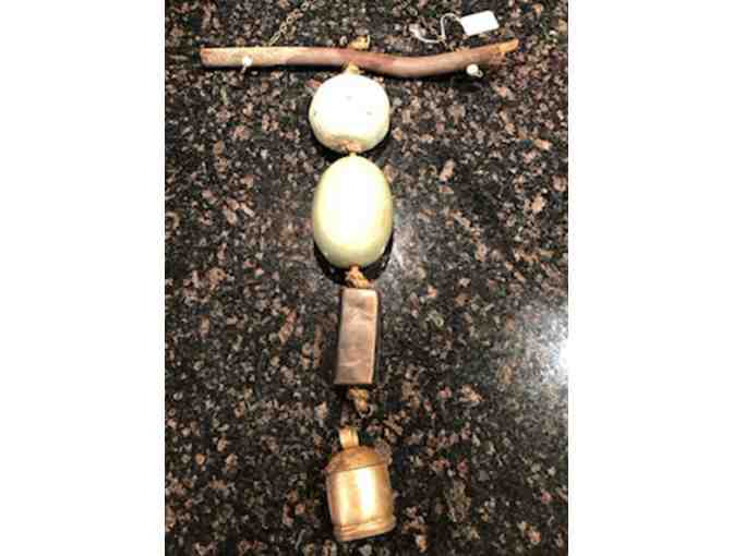 Beautiful handmade clay beads 4-5" in diameter each with small Noah bell at bottom. Local artist. One of a kind.