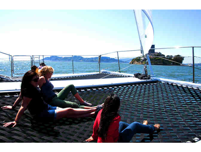 Bay Sail: For an hour and half, you’ll be treated to fantastic views of Alcatraz Island, the city skyline, the Golden Gate bridge and the Pacific Ocean. If adventure is your style, try out our deck trampolines (be warned, you may get wet!). The netting allows you the exhilarating feeling of having the waves rush under your feet, and are also extremely comfortable for lounging in the sun. Want a break from the wind? Come inside our protected cabin, have a seat and continue to enjoy the sights of the sky and water. Need a bite to eat? Snacks, soda, beer and wine are available for purchase at the cabin bar. Our sailing catamarans give a uniquely stable and quiet ride without the noise of engines—you’ll be amazed at the speed wind in your sails can give you! Pick up an audio tour (available in 7 languages) with a helpful navigation guide providing information about San Francisco’s landmarks as you sail past them. Feeling confidently sea-worthy? Take the helm from the captain and steer the boat. Our captain and crew are always happy to snap a photo or answer your questions about San Francisco or our catamarans—you’ll quickly learn our passion for sailing!