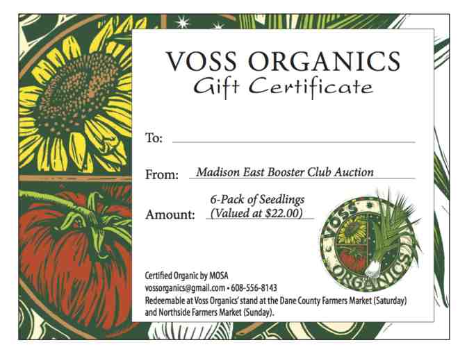 Redeemable at Voss Organics stand at Dane County Farmers Market (saturday) or Northside Farmers Market (sunday).